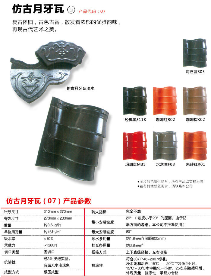 水泥瓦產品鎖邊是有很精準的細節方面的設計方案,那樣能有利于降低瓦體的形變,提高了水泥瓦片的防潮性,燒制的溫度高、吸水性低,一切正常鋼筋搭接總面積小,水泥瓦節約工程施工的輔材。水泥瓦企業引入了海外優秀的陶瓦加工工藝,也有一整套的水泥瓦全自動流水線,選用的原料是原生態粘土,因此要想用高檔的產品,水泥瓦是不二選擇,它為全家人萬家出示出安全性舒服、綠色環保和滴水不漏的平屋面庇佑實際效果,它是大家的重任。